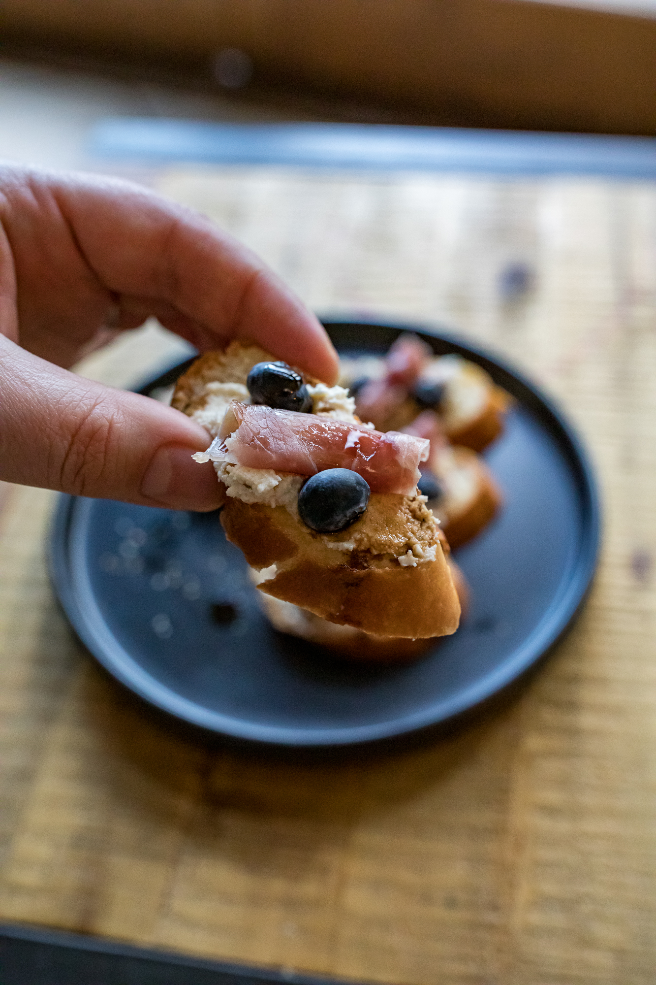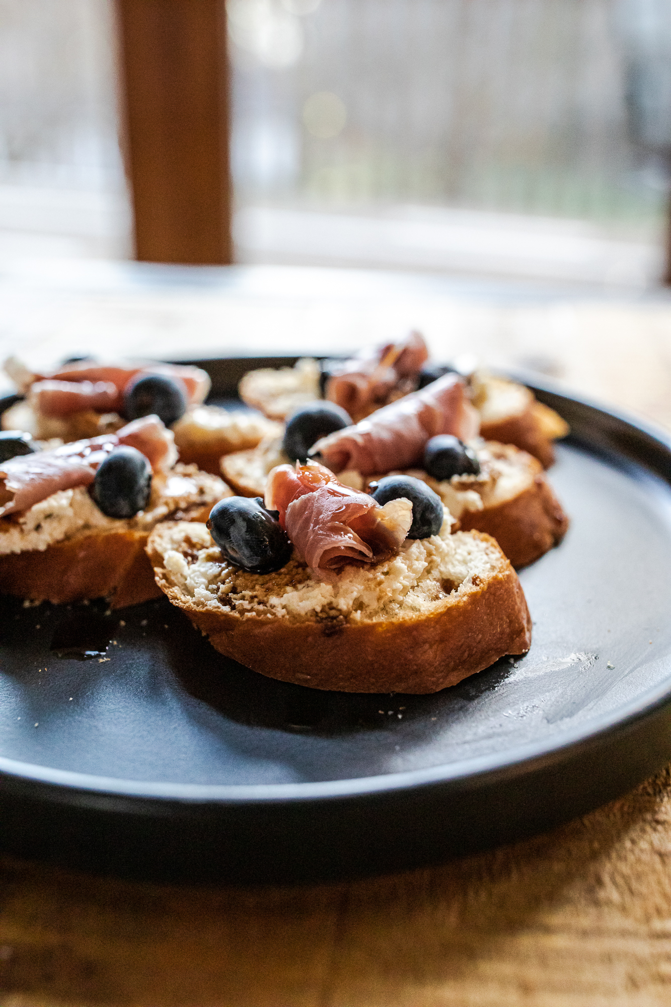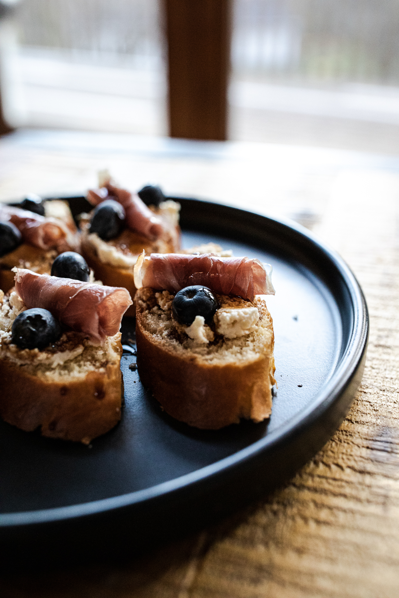 - Appetizers assemble - Mix up the smoked goat cheese with the roasted garlic rub, and the confit smoked garlic you reserved from the oil, and spread it allll over those toasted rounds. Top with blueberries, a rolled piece of prosciutto, and a drizzle of your balsamic glaze.