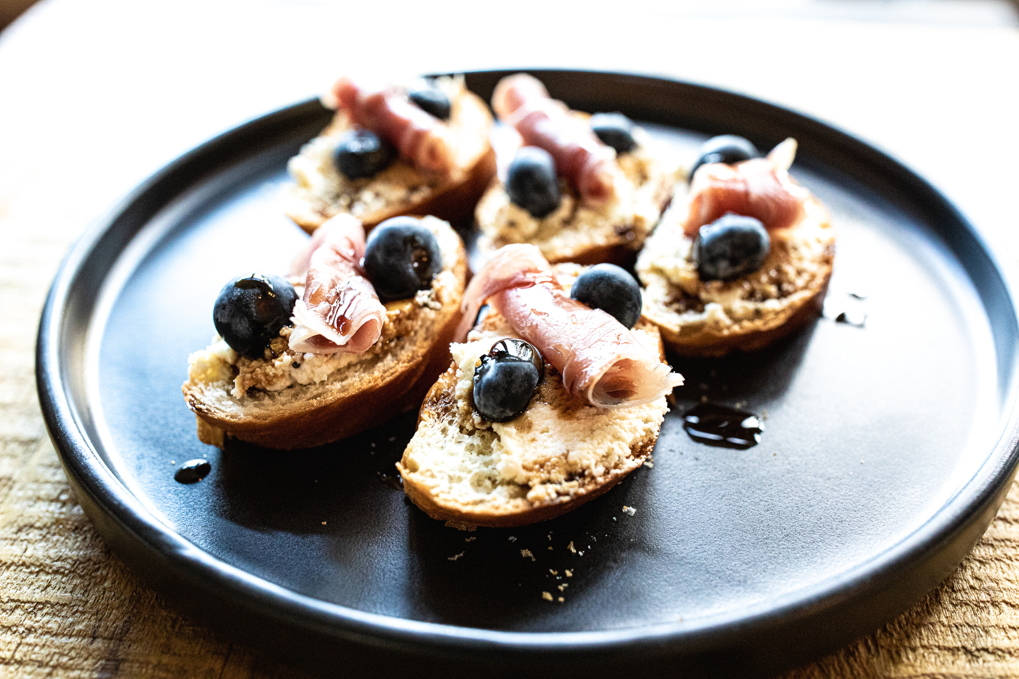 - Top with some rolled prosciutto, blueberries, and a drizzle of balsamic glaze.