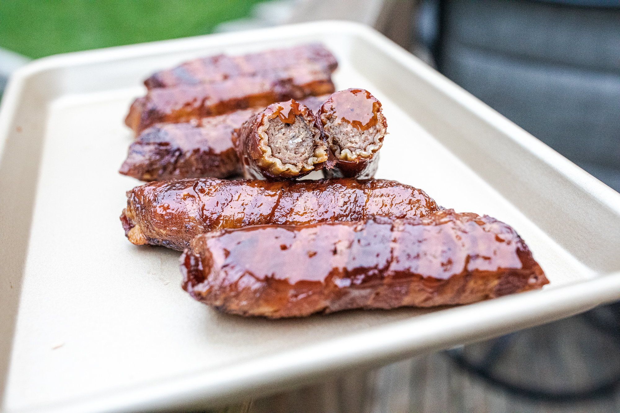 - Mix and Glaze - Mix up all the glaze ingredients, and when the bacon fat is rendered, and it is starting to firm up, paint the glaze onto the shells. Cook 10 more minutes, roll those bad boys over and paint the other side. Cook 10 more minutes and remove from the grill and enjoy!