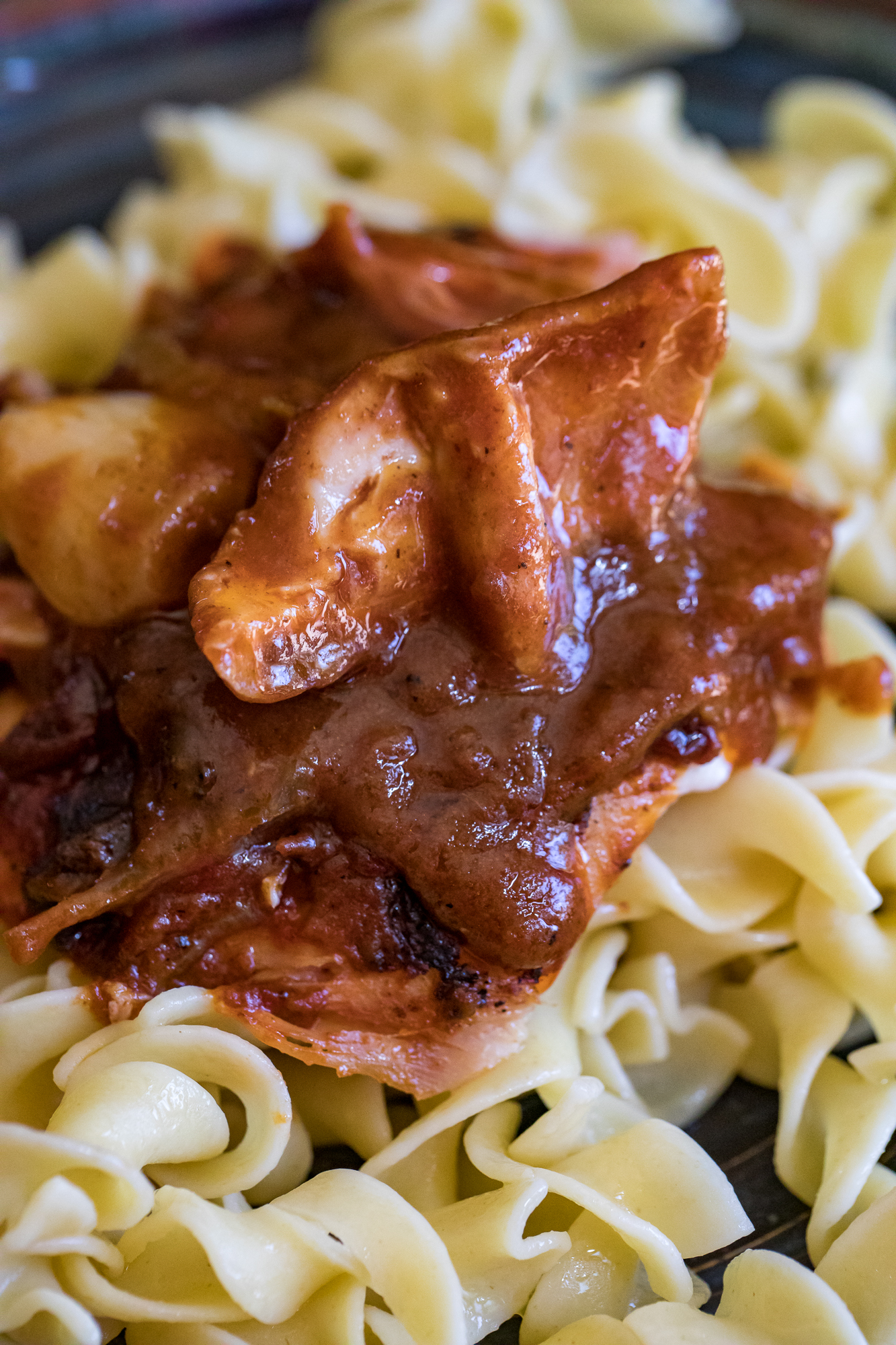 - When cooked, remove from the heat, remove the chicken from the pan, and stir in the cream and sour cream. Serve the chicken over buttered egg noodles and ladle sauce over the top.