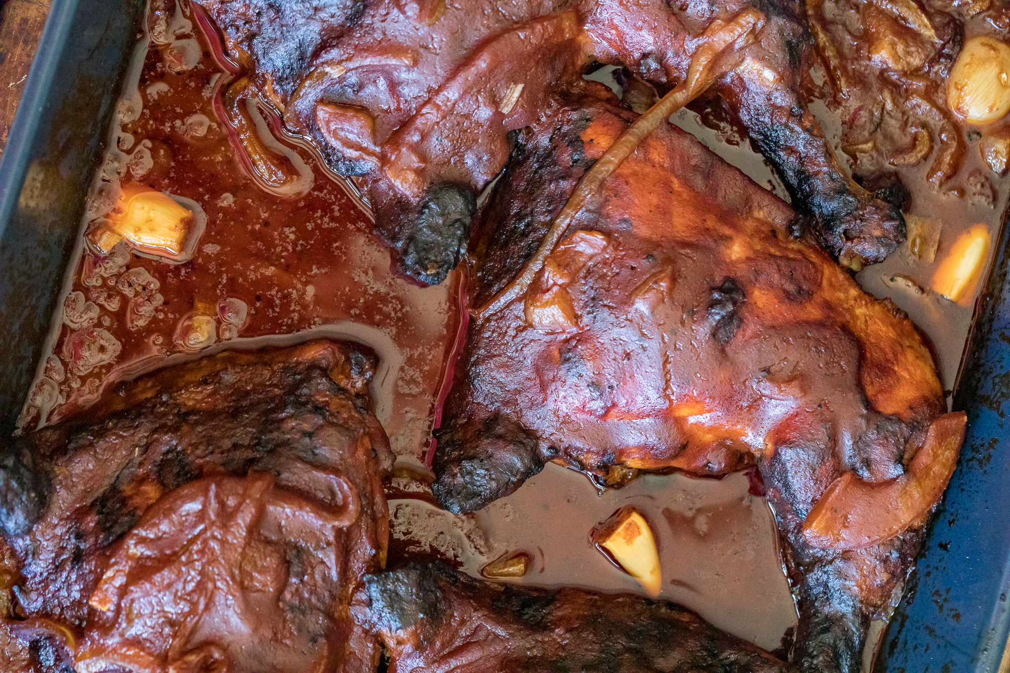 - Sauce & Grill - Whip up the sauce, put the chicken skin-side up in a grill-safe baking dish with the onions and garlic (MadeIn Bakeware is my favorite), cook the roux, pour the sauce over, and toss back on the grill at 275°. (Make sure to follow the recipe card instructions here, there are a few more steps that are important!)