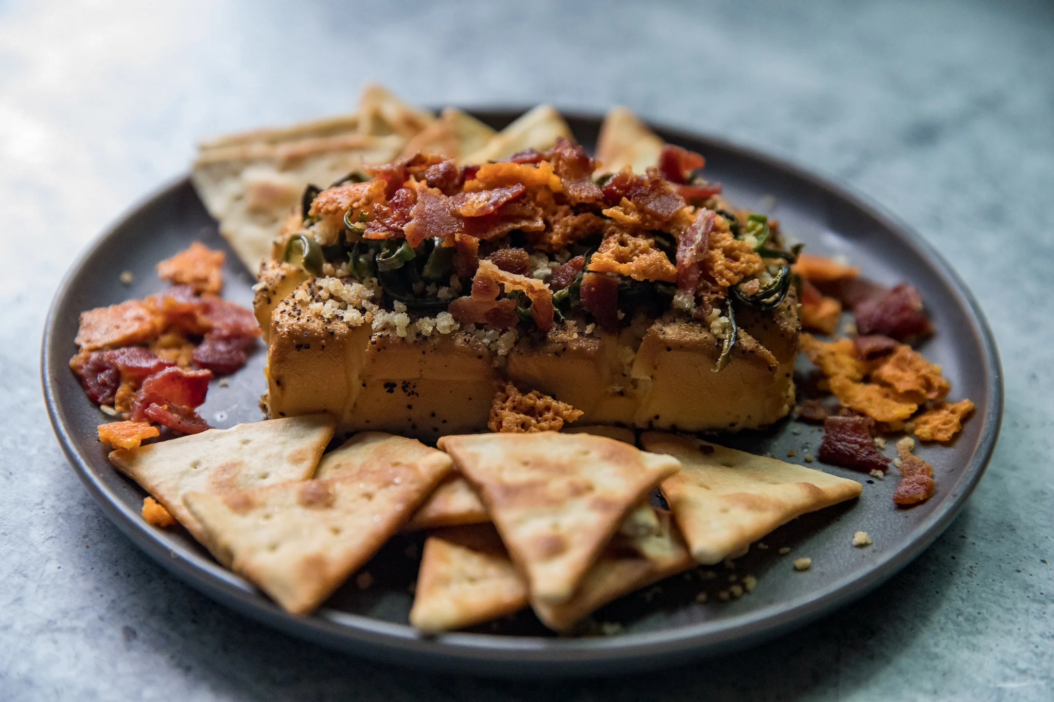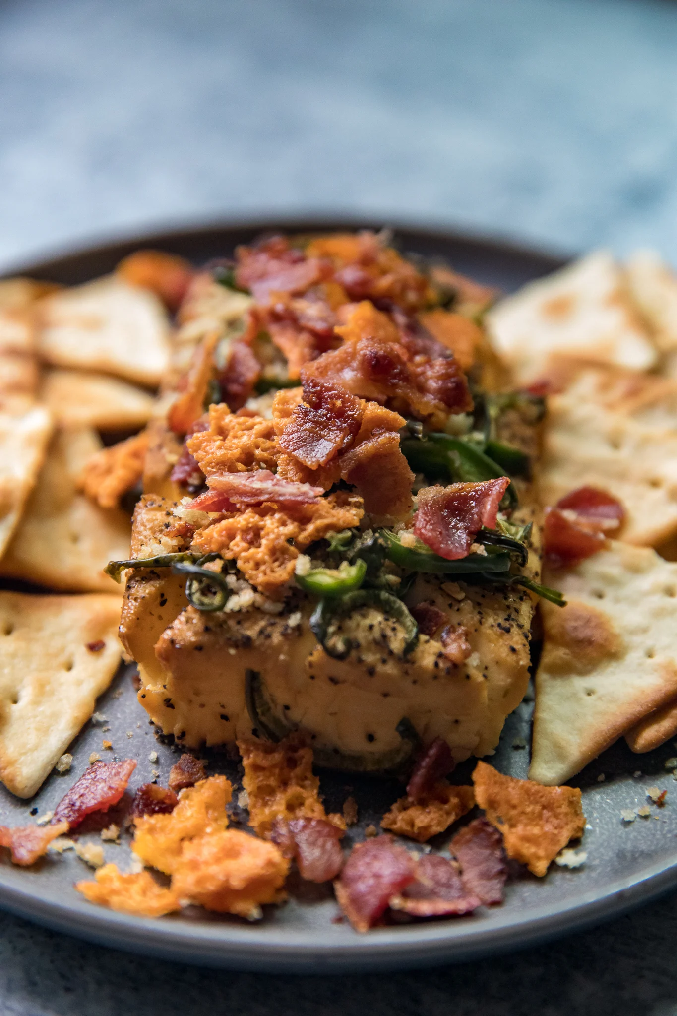 - Top and enjoy – Top the smoked cream cheese and jalapenos with the cooked bacon, toasted bread crumbs, and the cheddar cheese crisps. Serve with crackers and vegetables.