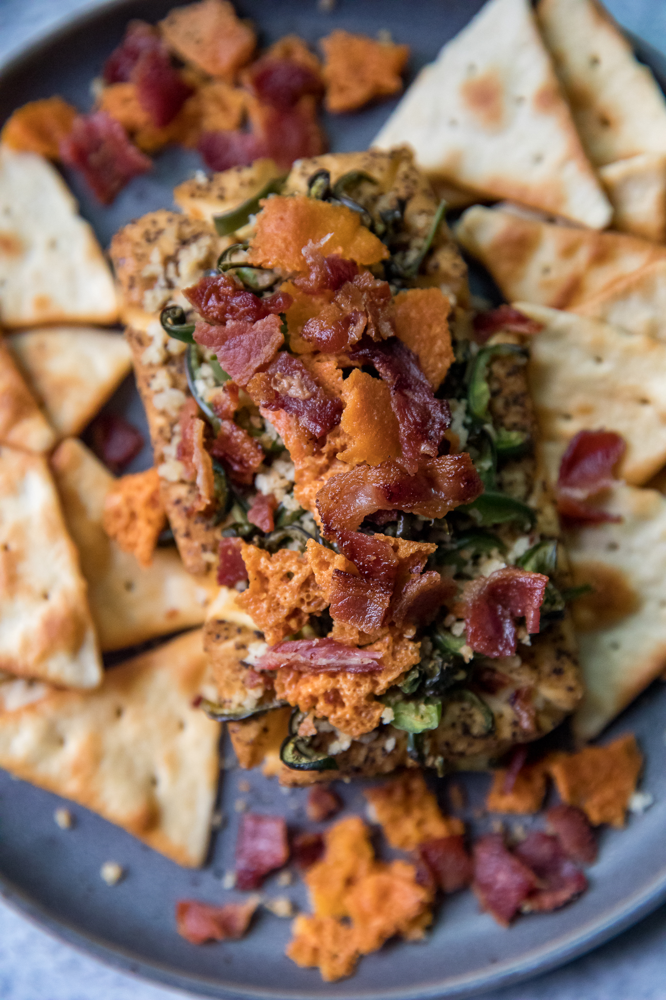 - Top and enjoy - Top the smoked cream cheese and jalapenos with the cooked bacon, toasted bread crumbs, and the cheddar cheese crisps. Serve with crackers and vegetables.