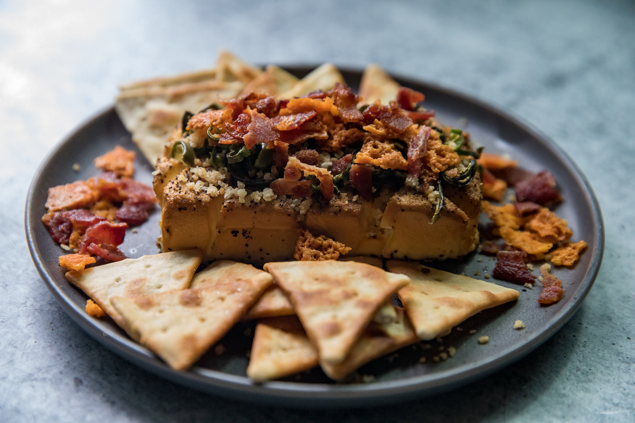 - Once the cream cheese is done smoking, top with the browned bread crumbs, cheddar cheese crisps, and crumbled bacon. Serve with chips and crackers and vegetables for dipping.