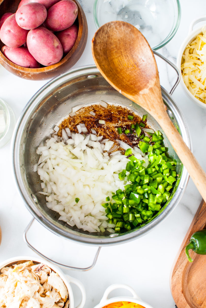 - Return the soup pot to the stove over medium heat. Add the chopped onions, chopped jalapeños, and a couple teaspoons of the reserved bacon grease to the pot. Sauté the vegetables over medium to medium-high heat until they begin to soften and caramelize.