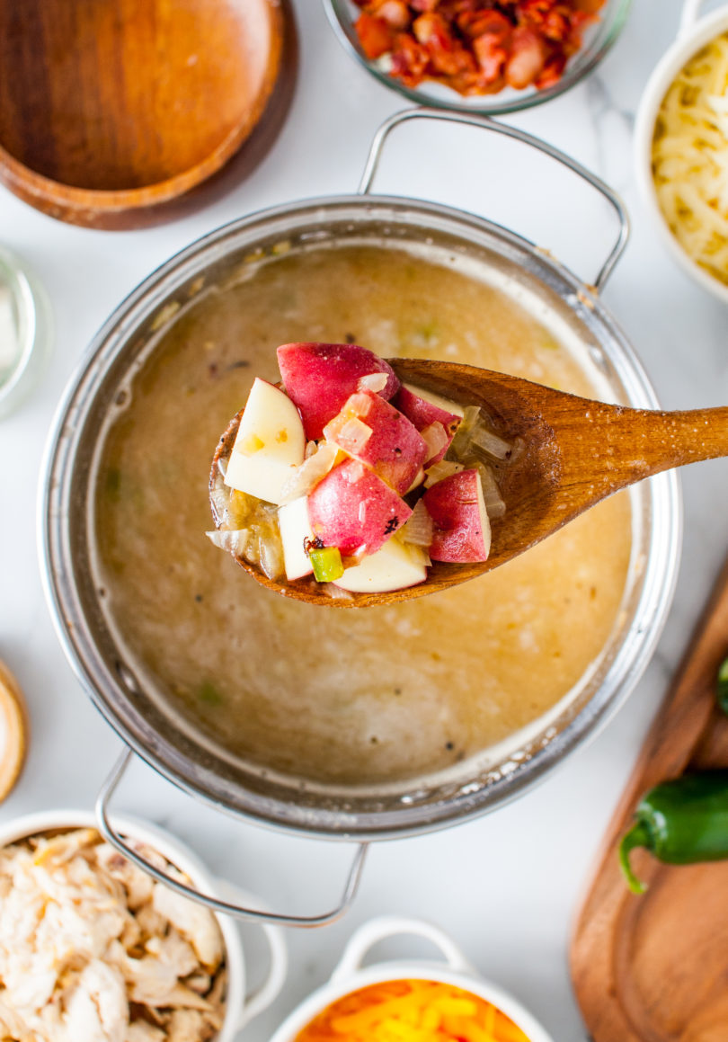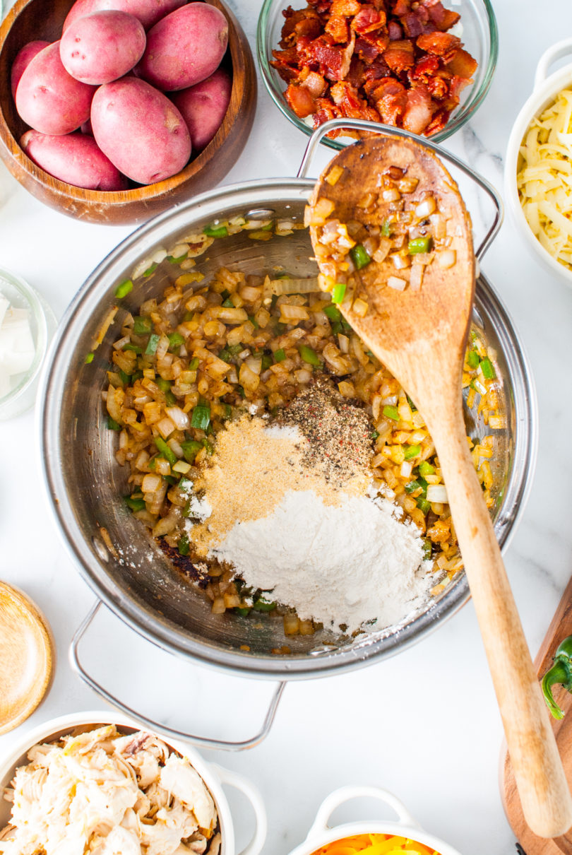 Add a couple more teaspoons of bacon grease and the flour, salt, pepper, and garlic powder. Mix and cook over medium heat for 3-4 minutes. - Soup it up – Add the chicken stock and the lemon juice to the pot. Add the potatoes and simmer until the potatoes are tender. Turn the heat down to low to medium-low, add the cream and cream cheese. Stir until combined. Add the cheeses gradually, stirring often, until it is fully incorporated into the soup. Add your smoked chicken.