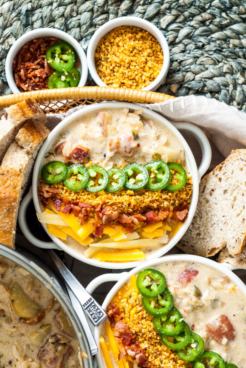 - Assemble – Stir in half the cooked bacon to the soup. Top the portioned soup with sliced jalapeño, shredded cheese, chopped bacon, and the toasted bread crumbs.