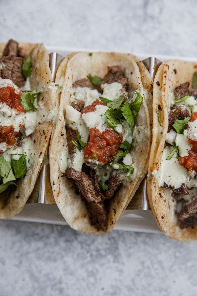 We’re celebrating the BEEF here with simple seasoning of salt and pepper and a quick hot-and-fast cook on the griddle. Then you chop the beef, load it up with your favorite fixings in some warm toasty tortillas, and dive.right.in.