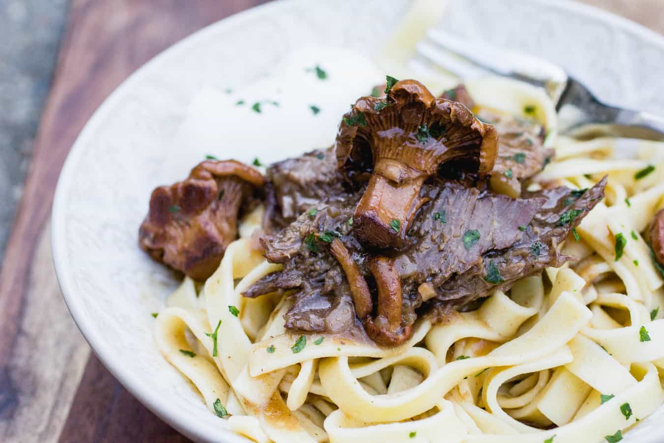 Chuck Roast Stroganoff is beef stroganoff made with chuck roast braised with red wine and onions until it is fall apart-tender. SO GOOD!
