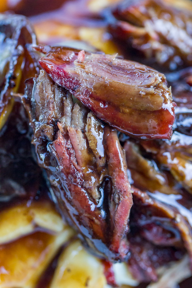 Smoked chuck roast braised in a balsamic, red wine, and broth mixture until shreddable and packed with tangy-sweet depth.