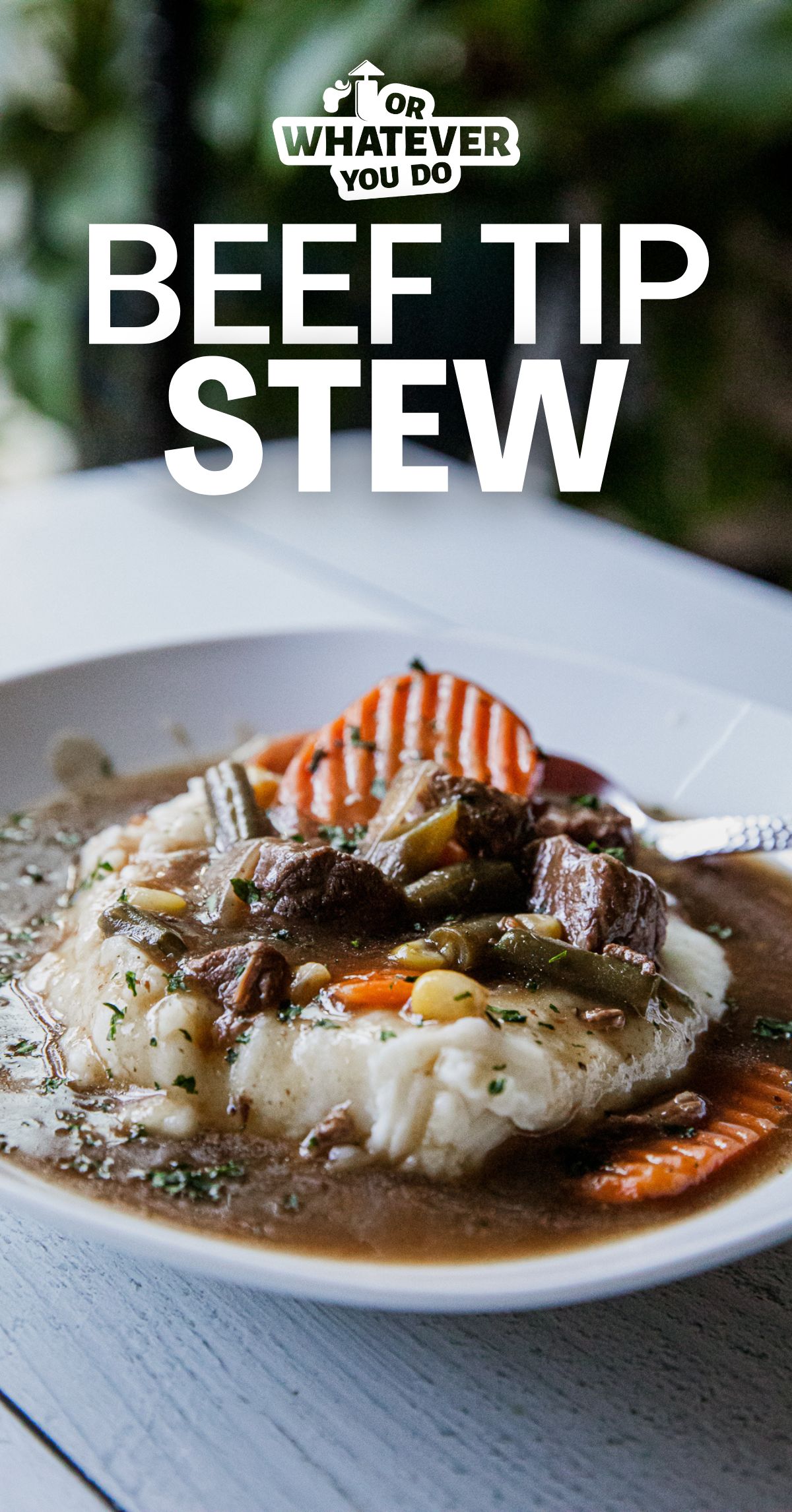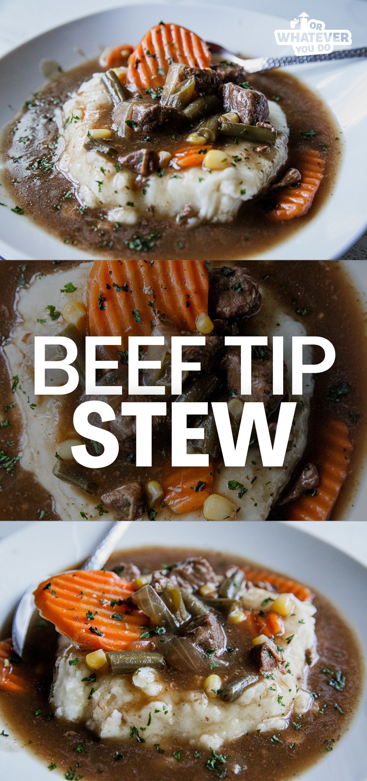 This hearty homemade beef stew is made with beef tips and vegetables. We like serving this over a big pile of mashed potatoes.