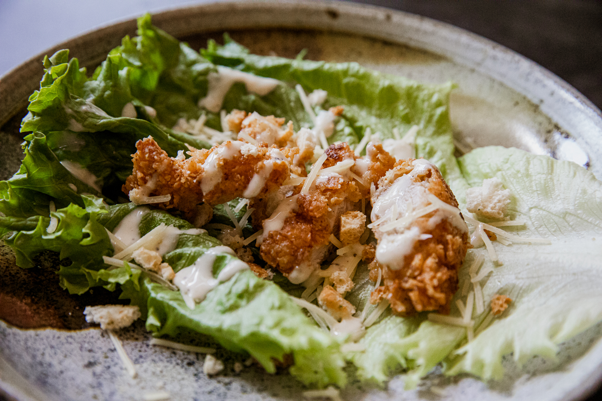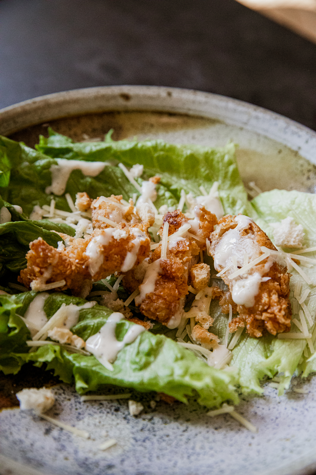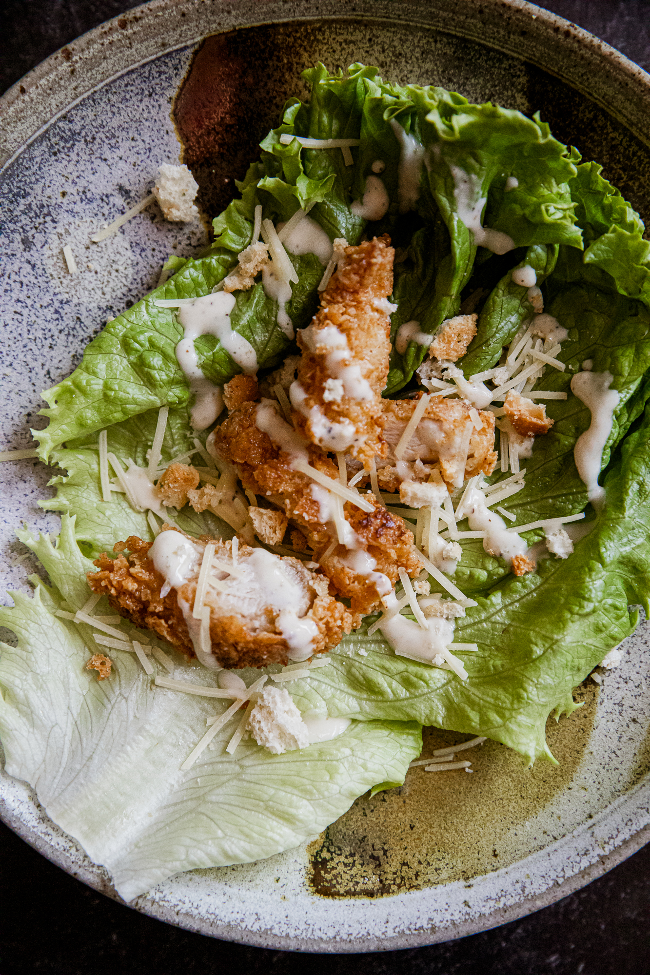 The Caesar dressing can be made 2–3 days ahead. The chicken can be fried earlier in the day and reheated before serving.