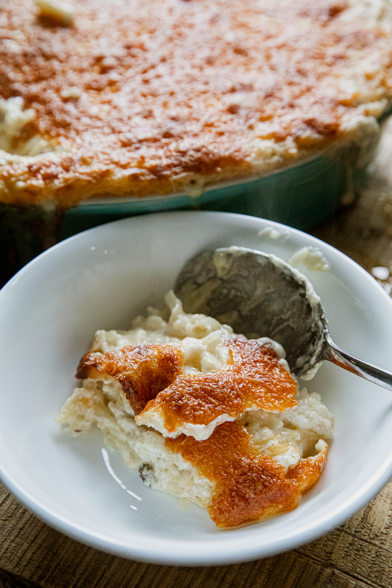 - Assemble and cook – Grease a large oval baking dish, pour in the mixture, and smooth the top. Sprinkle with the remaining cheese and bake for 45 minutes or until bubbly and golden.