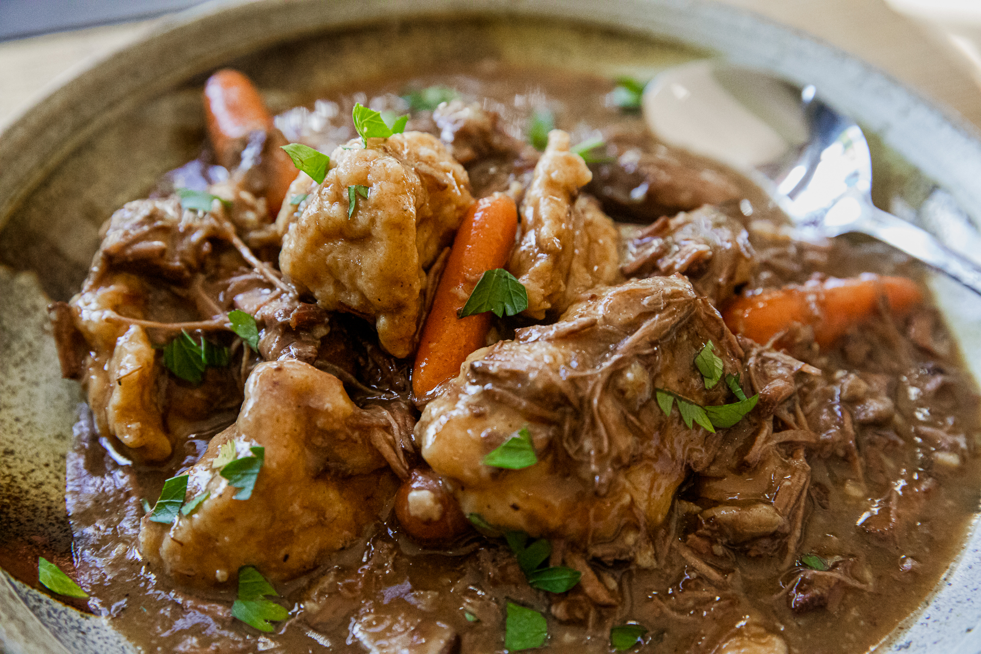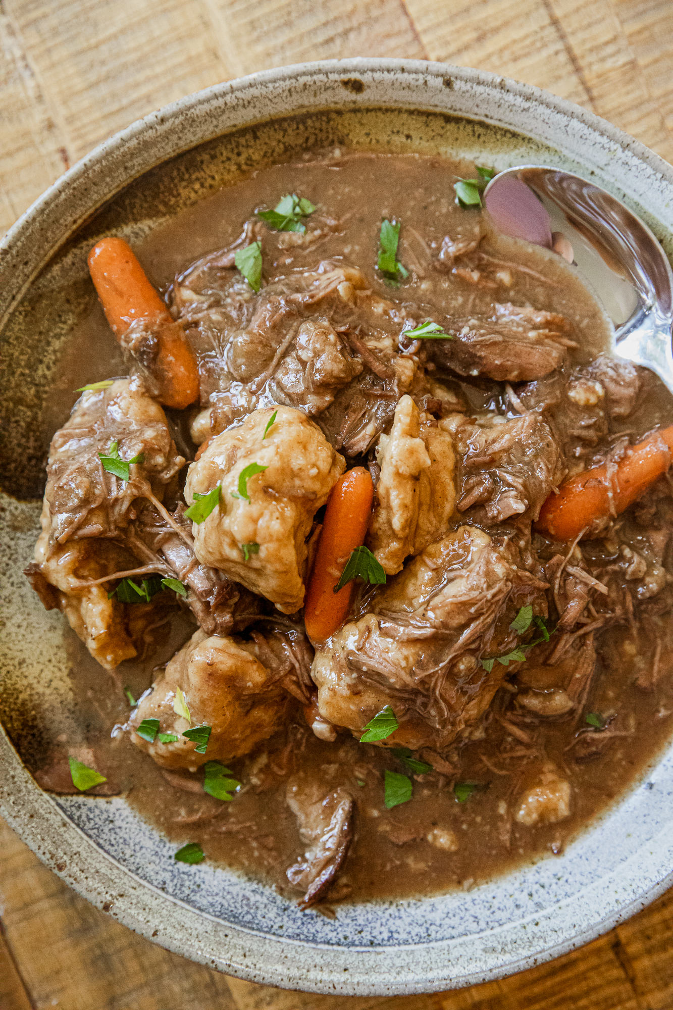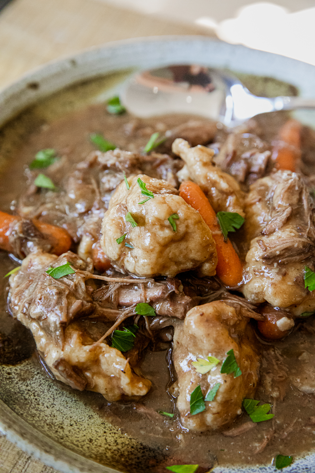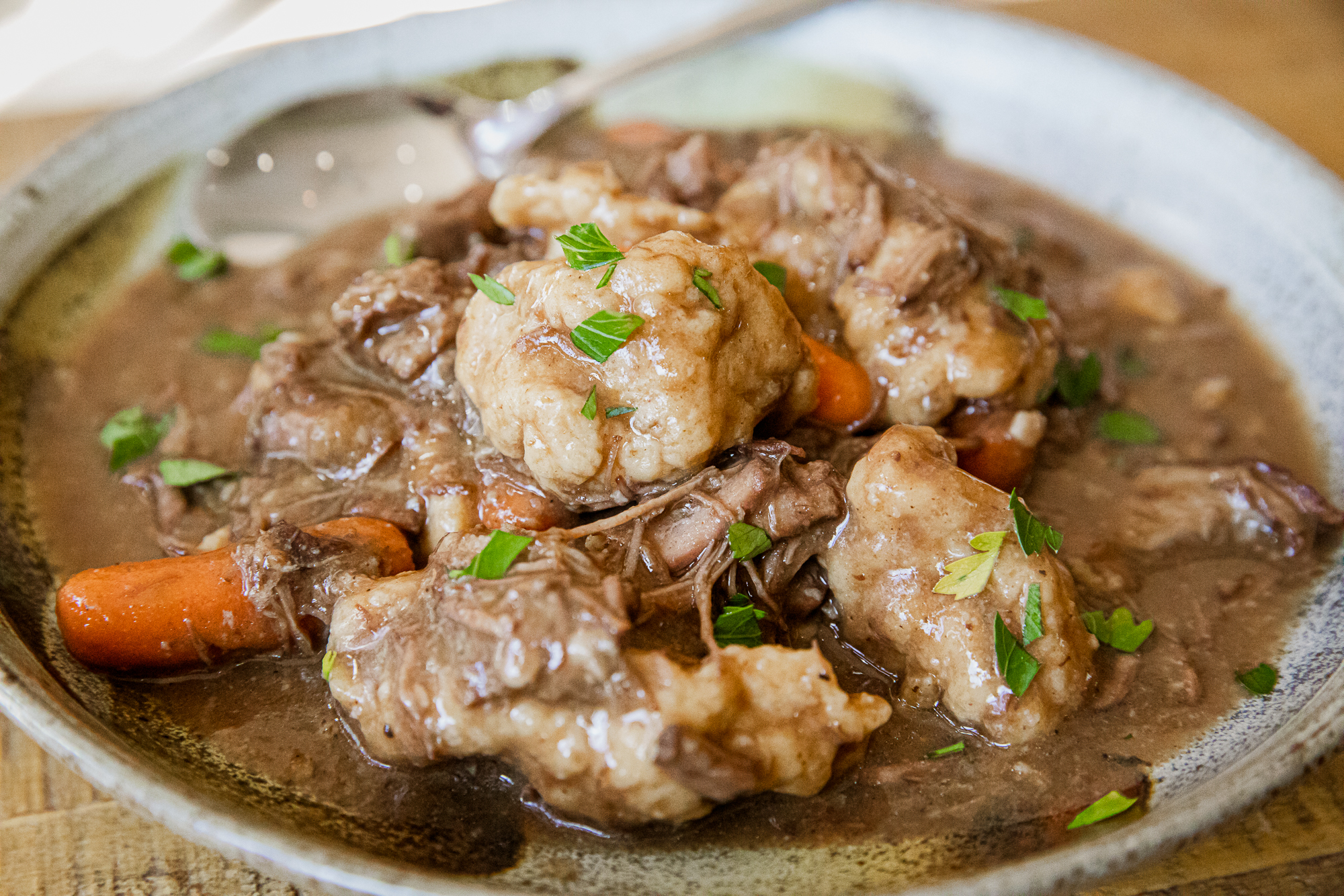 This recipe brings together two of our family’s favorites, beef stew and dumplings. The beef gets fork-tender after a long simmer, soaking up all that herby, garlicky broth and the dumplings are eggy, soft, and filling.