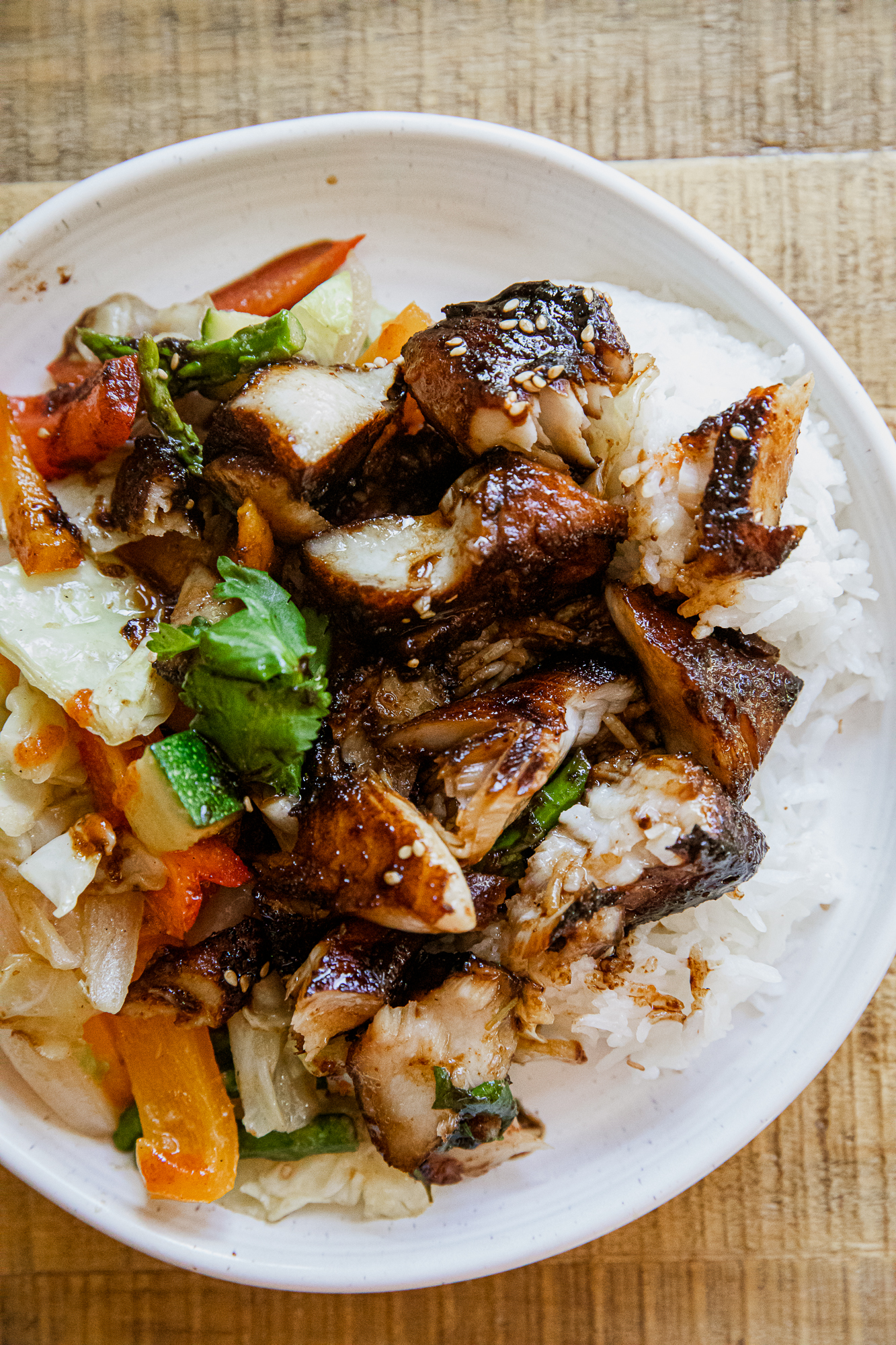 - Pull the fish from the pan and serve with rice.