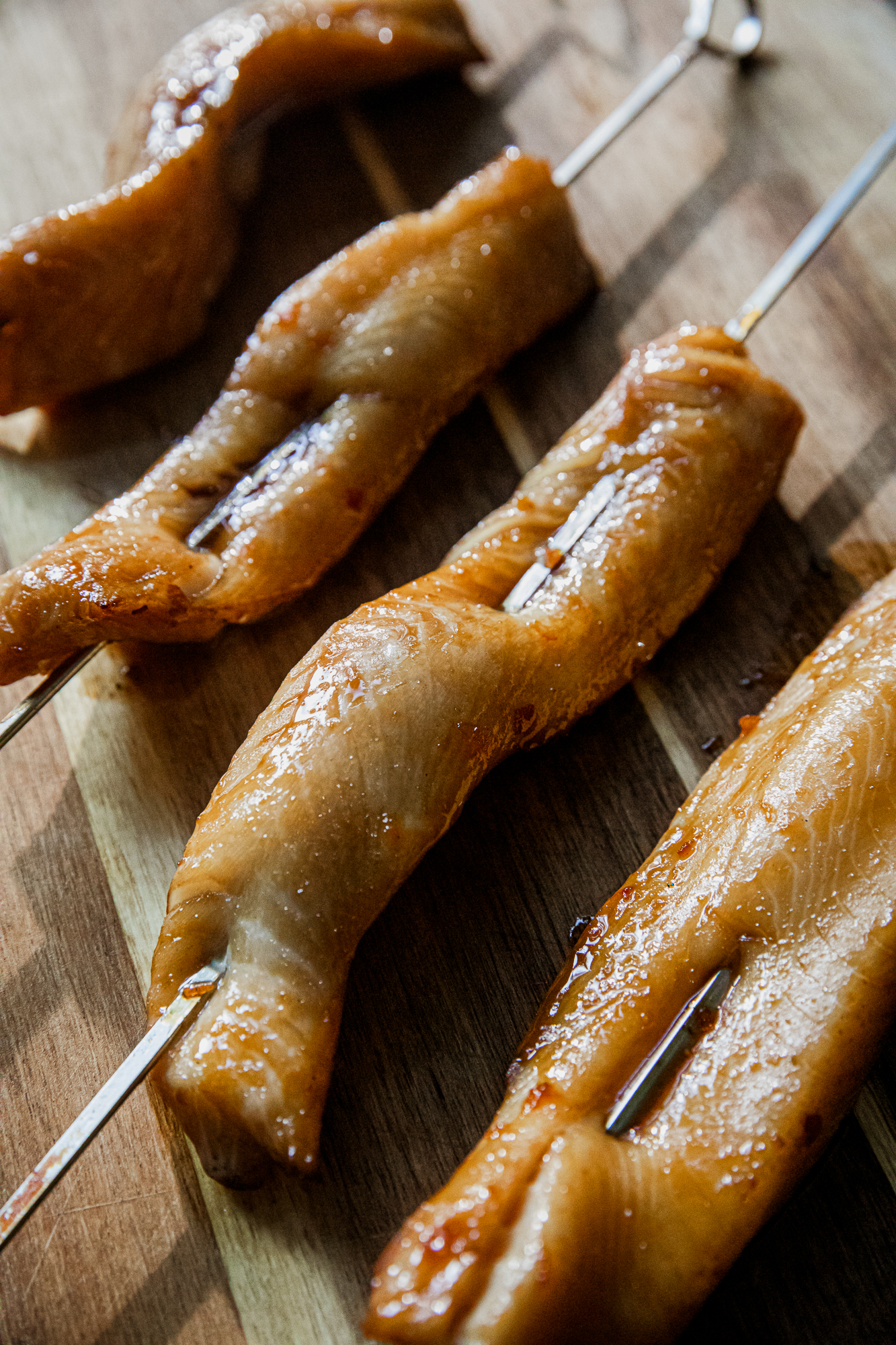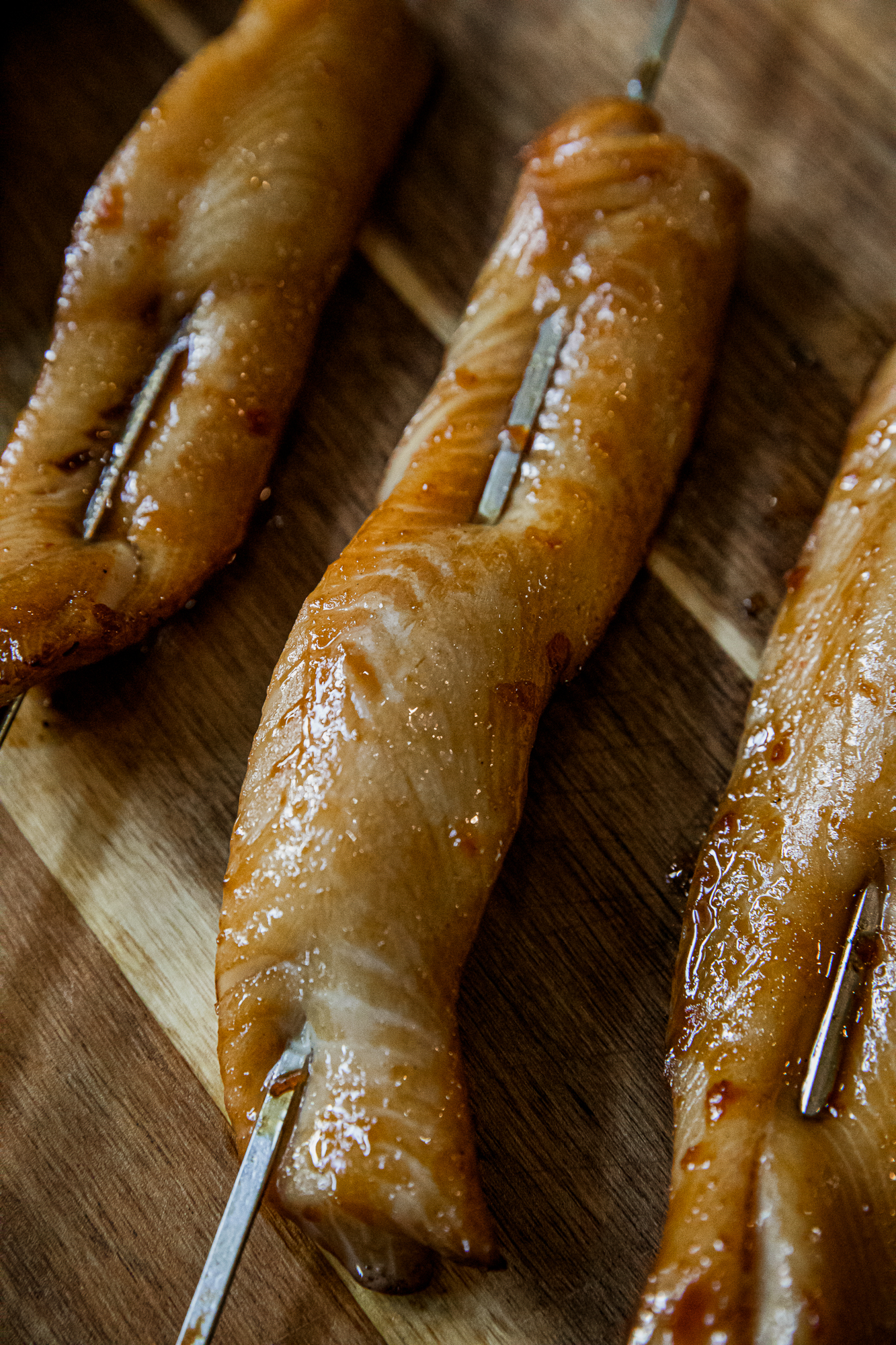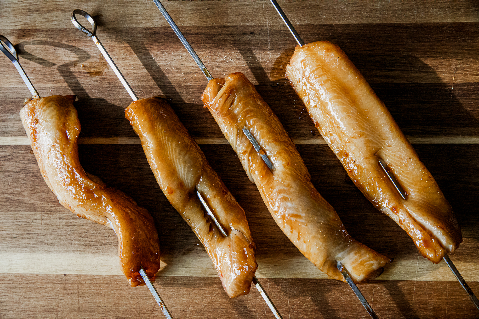 - Remove the fish from the marinade and thread the filets into metal skewers.