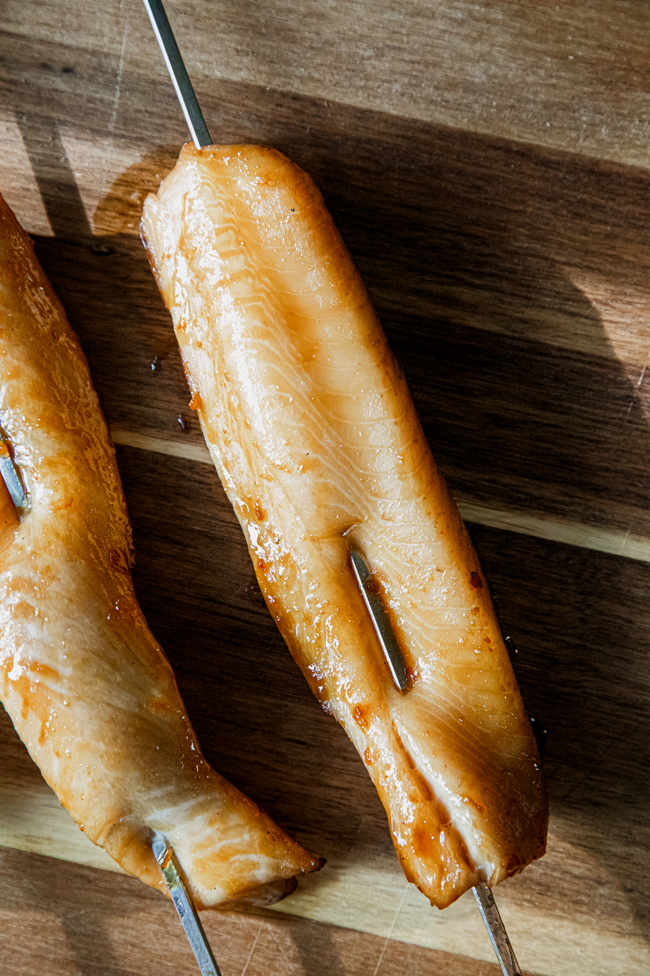 - Preheat & Skewer: Heat your Traeger to 450°F. Remove fish from marinade and skewer the filets.