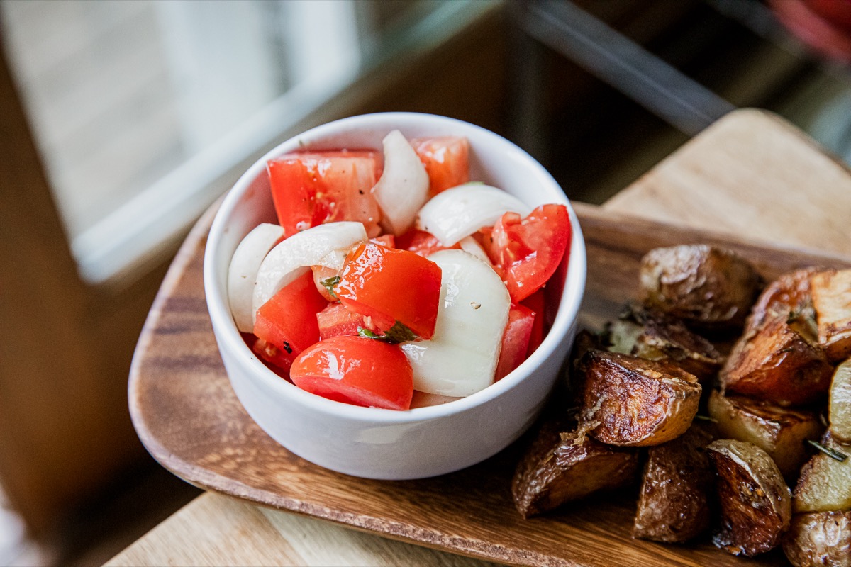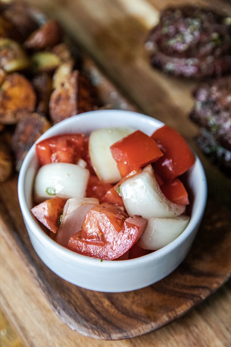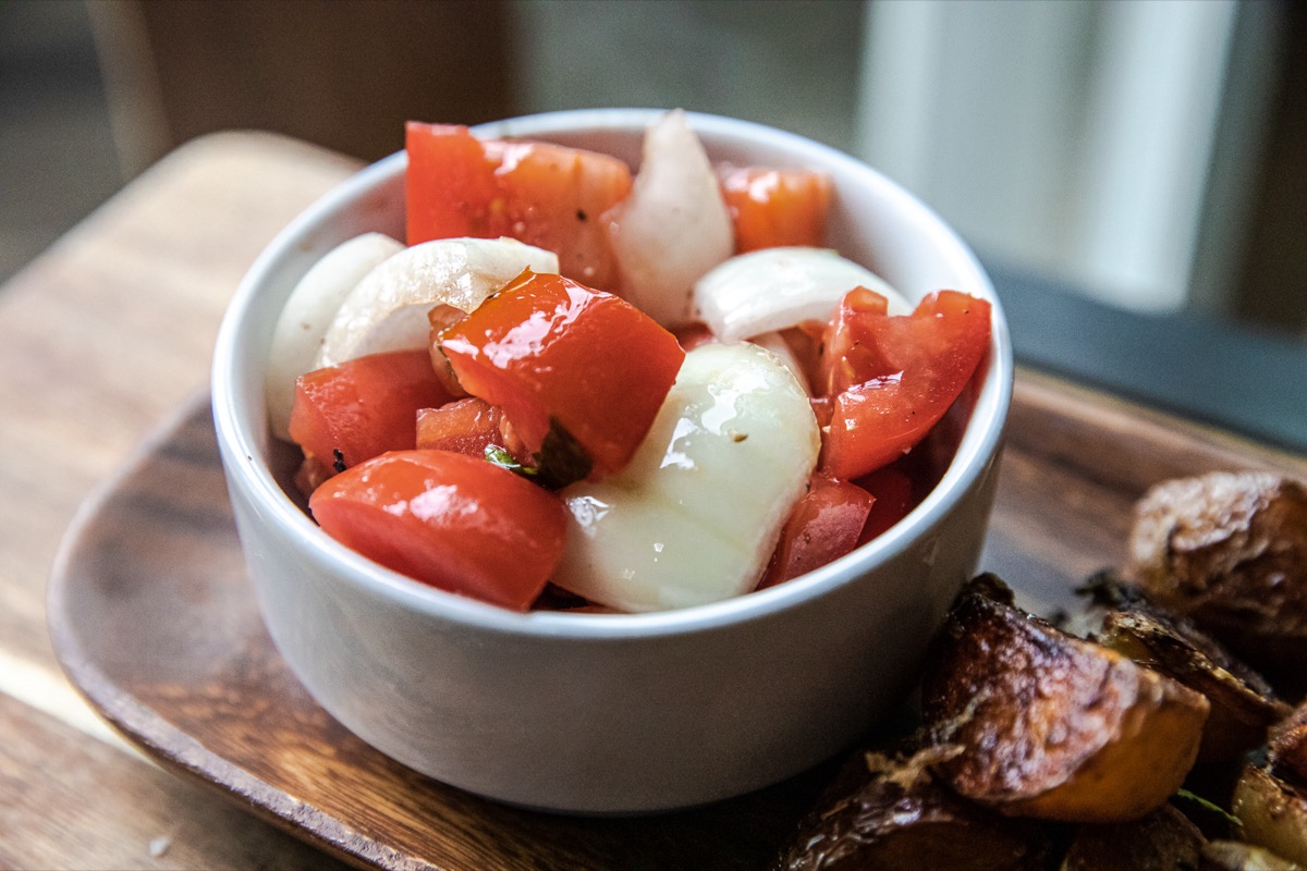 - Toss It Together – Combine the tomato and onion in a bowl. Pour dressing over the top and toss gently.