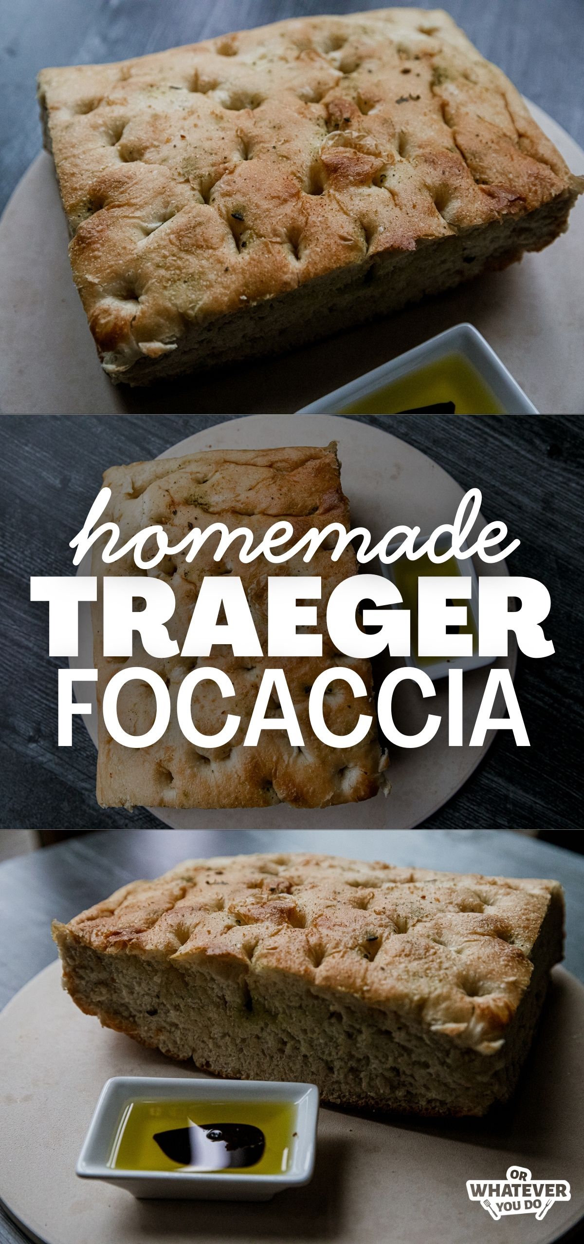 - Dimple And Bake – Press fingers into the dough to form dimples. Brush generously with olive oil and sprinkle with coarse salt and herbs. Bake on a preheated Traeger at 350°F using an inverted cake pan under the sheet until golden and 190°F internal.