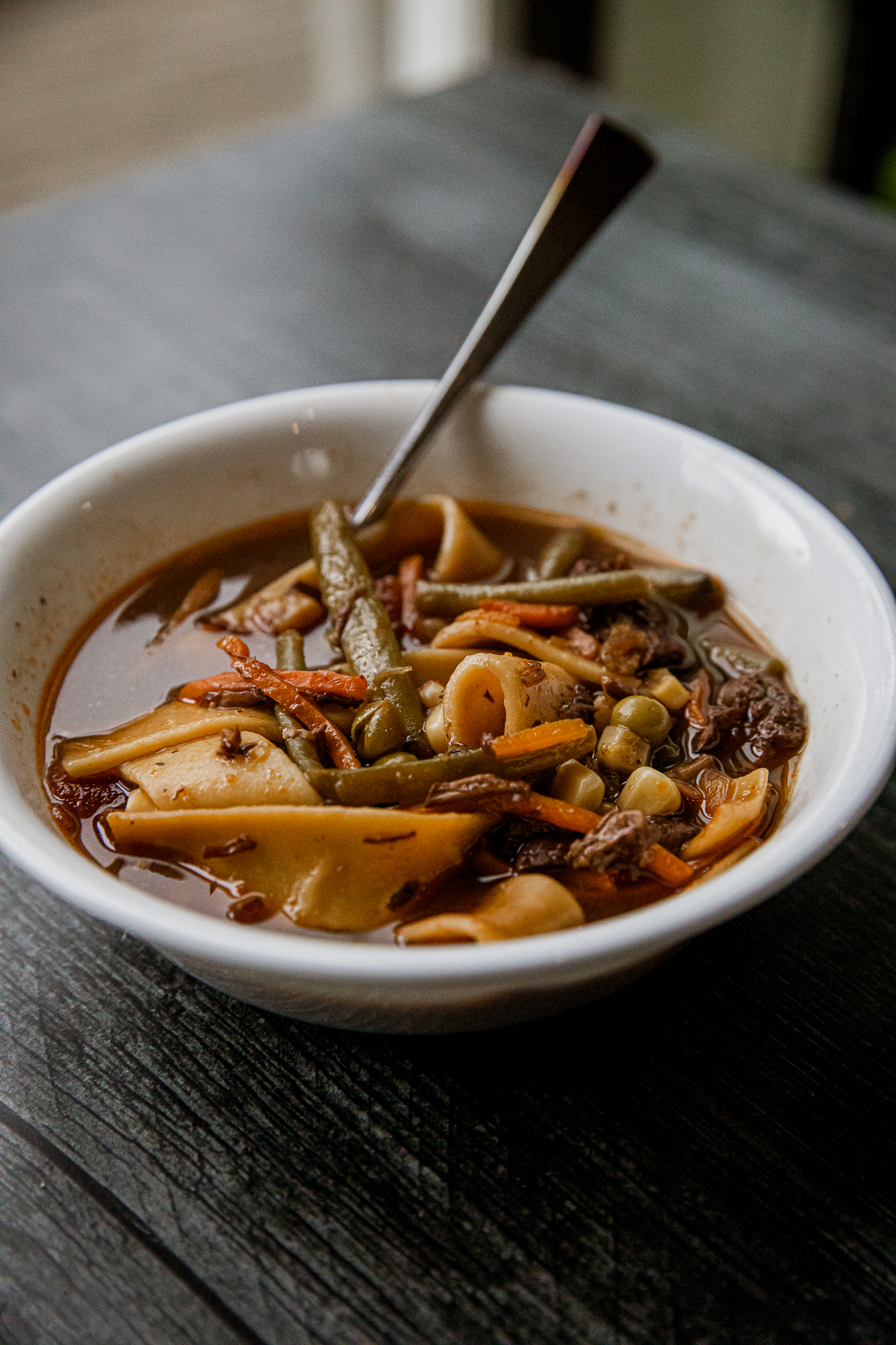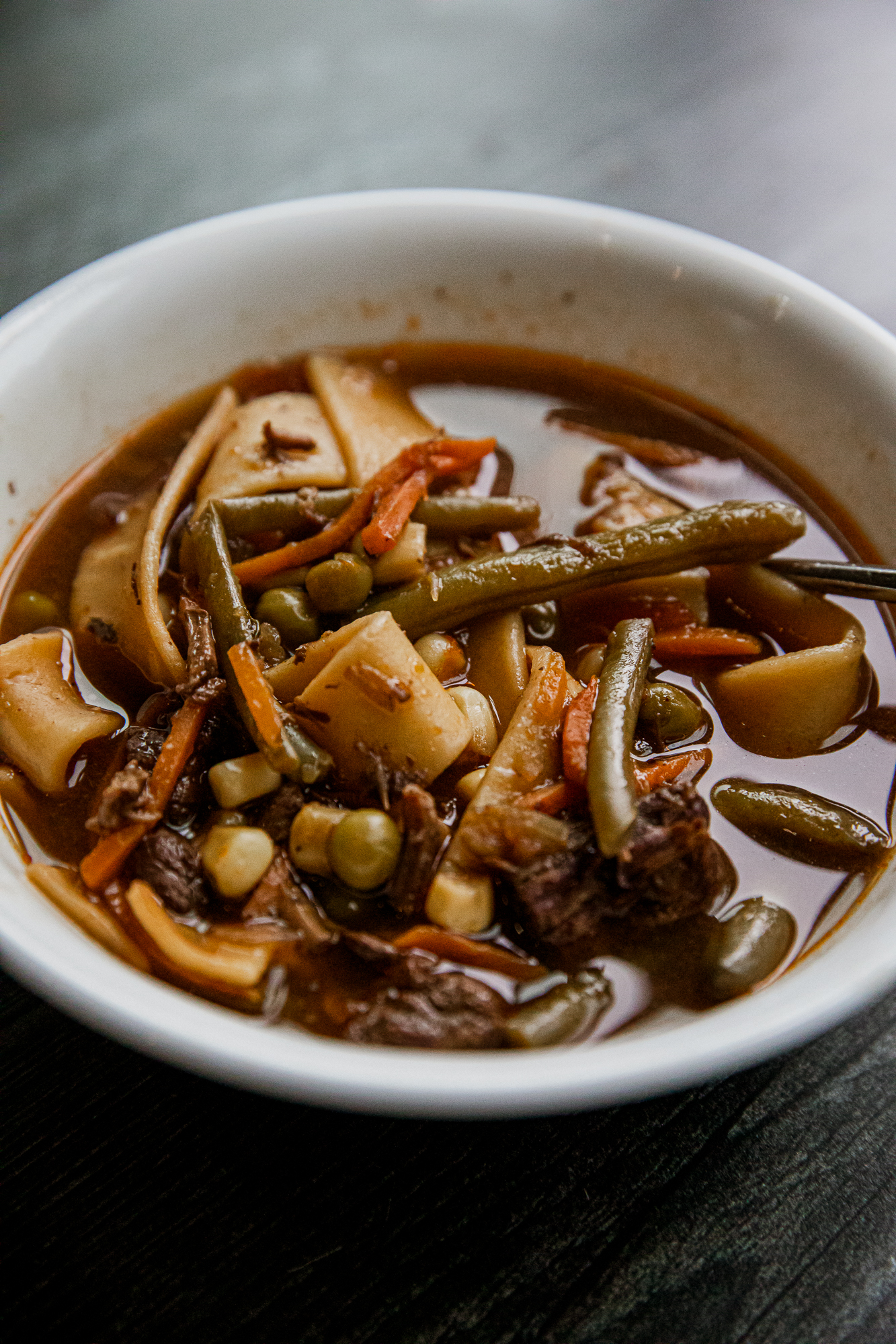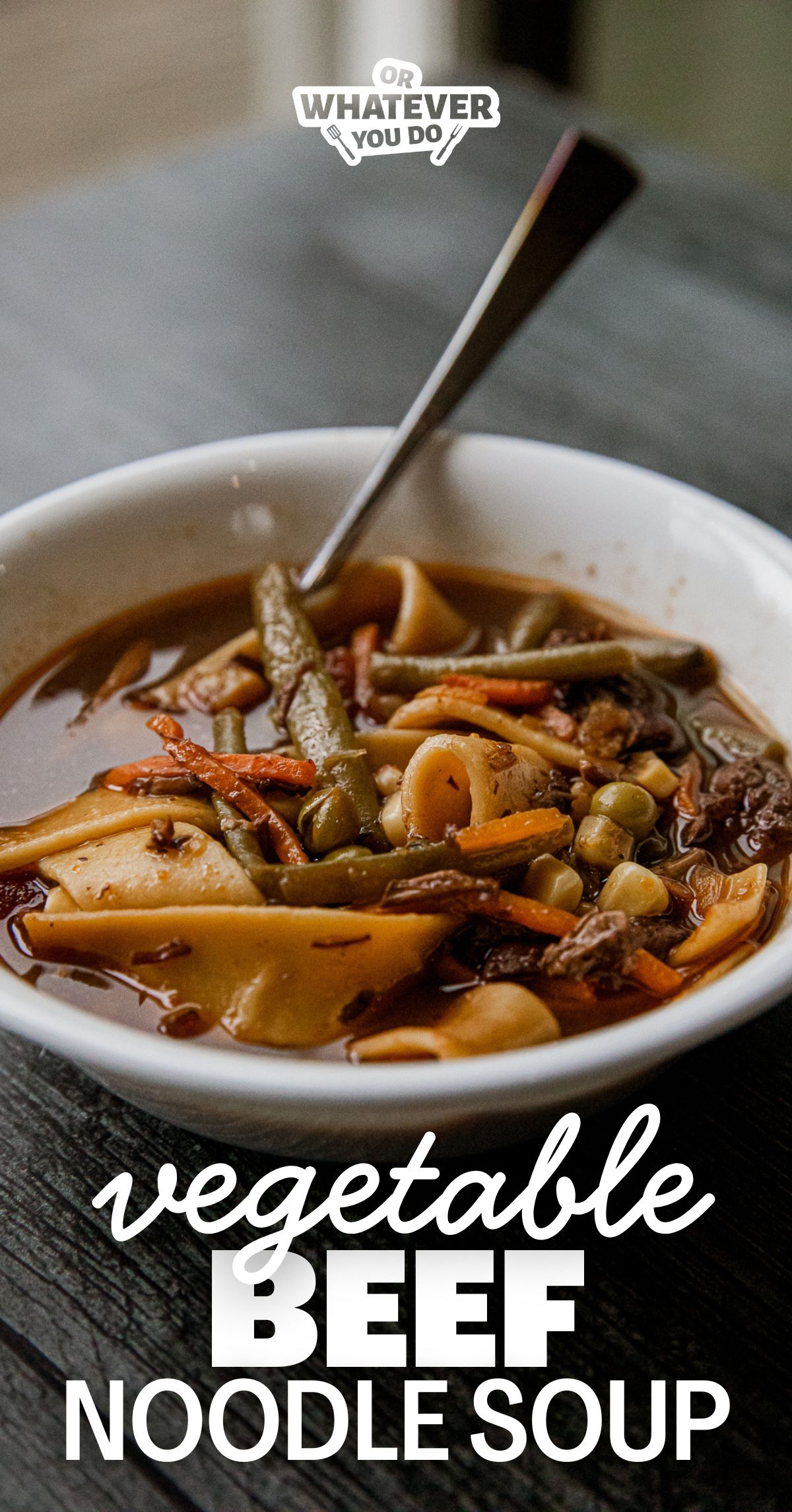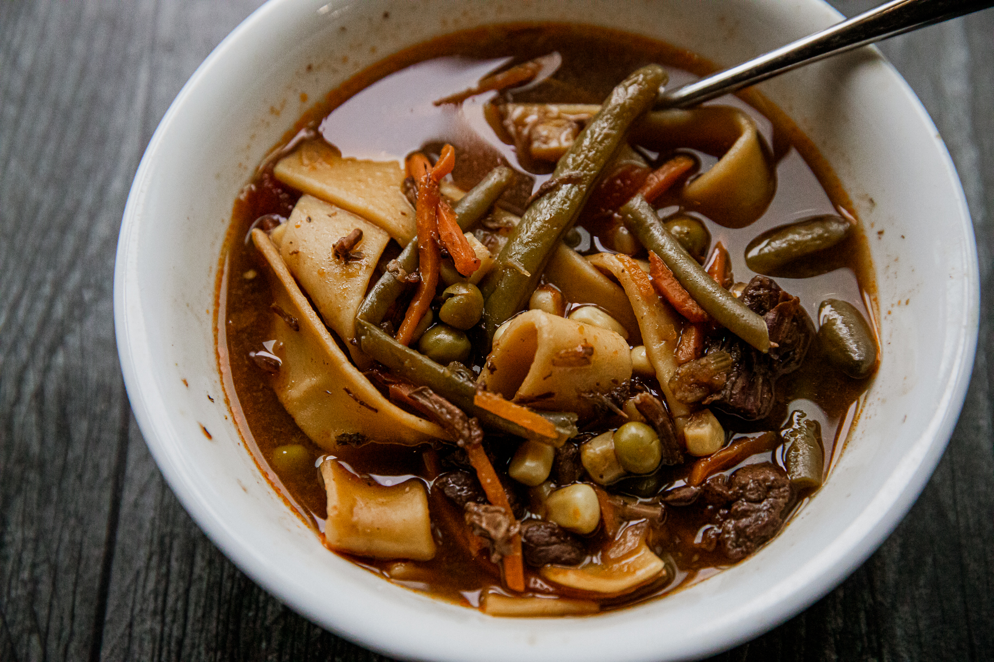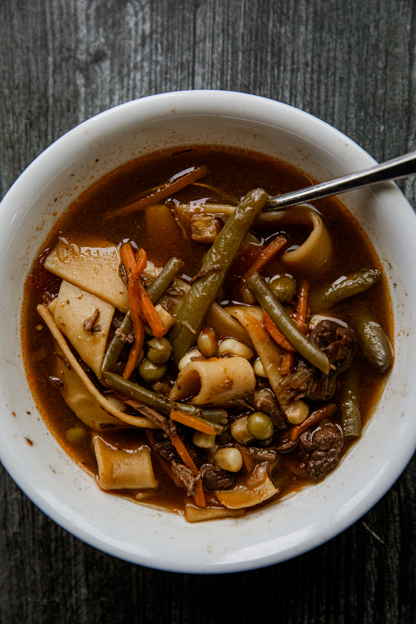 This soup brings together deep flavors from browned beef, seasoned broth, and slow simmered aromatics. The beef gets extra rich after a couple hours in the pot, and the combination of peas, carrots, corn, and green beans adds both texture and color. Homestyle egg noodles soak up the broth but stay firm enough to hold up for leftovers.