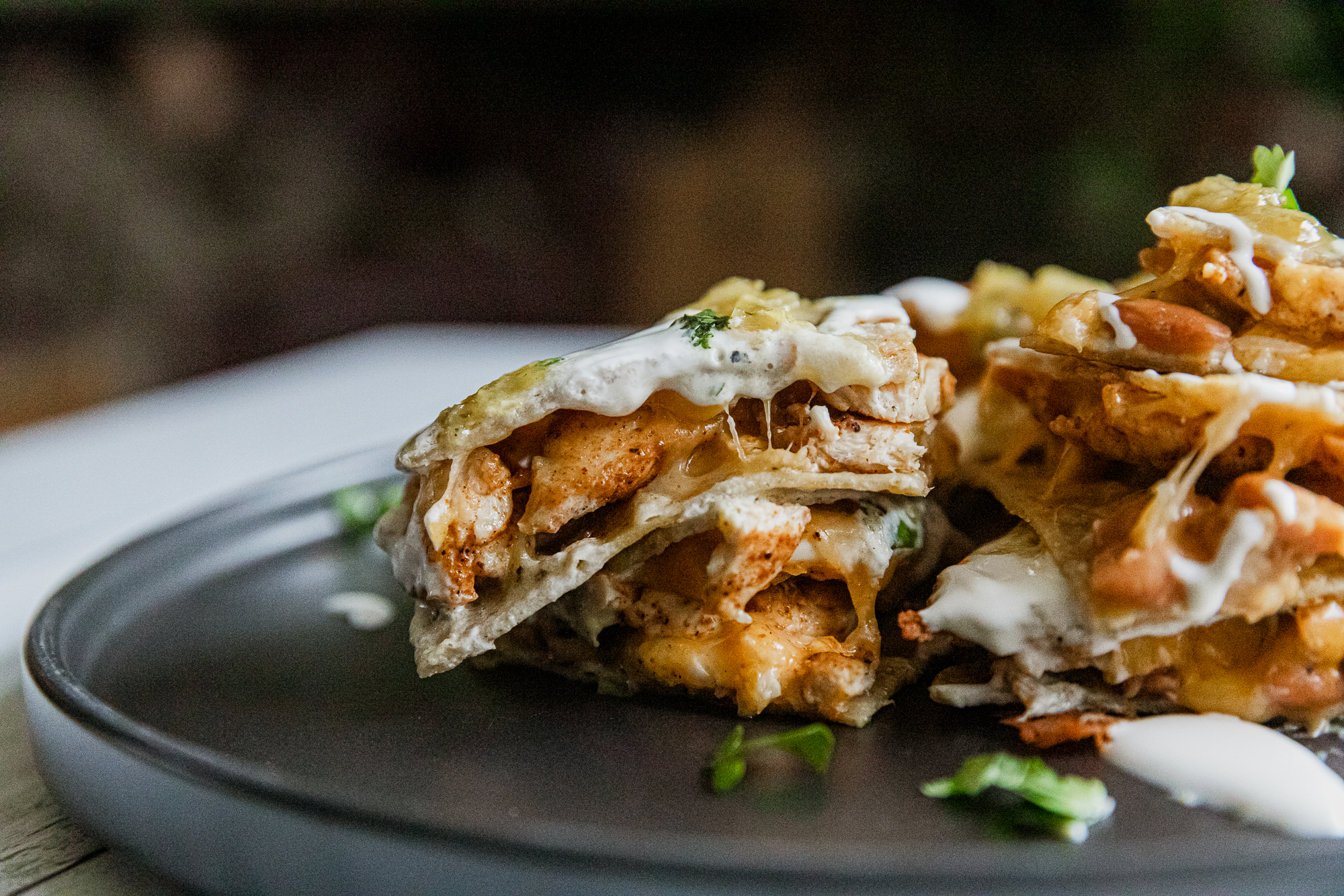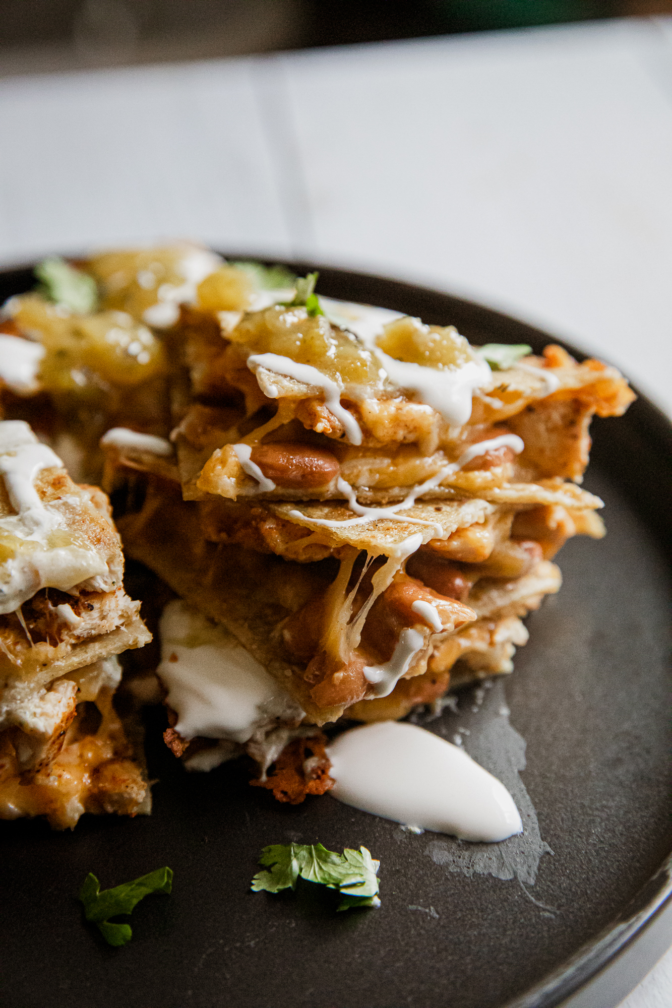 - Assemble, Crisp, And Serve – Top the cheese tortillas with beans and chicken, add more cheese, then cap with another tortilla. Cook a couple minutes per side, flipping once, until crisp. Garnish with salsa, sour cream, and cilantro, then slice into quarters.