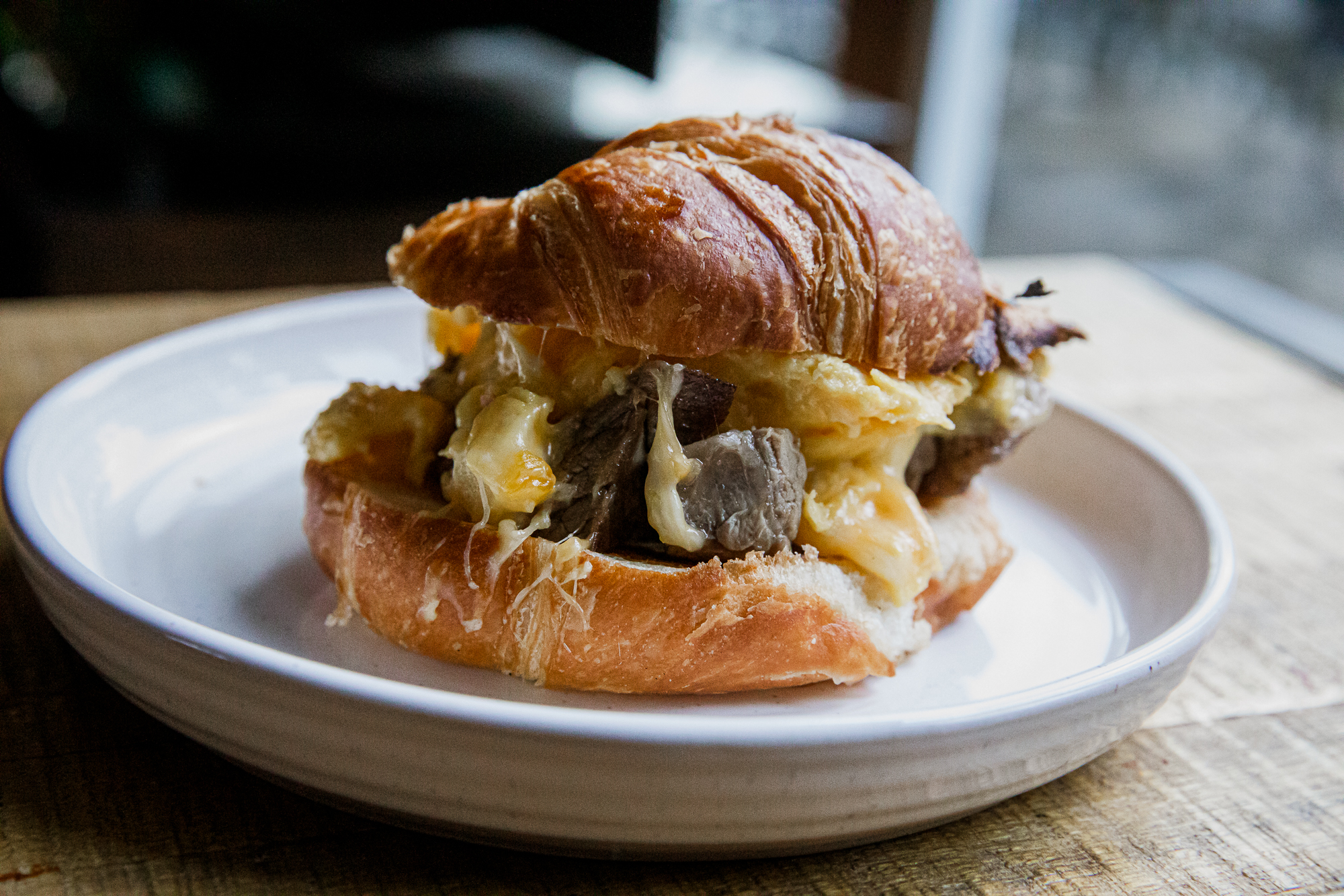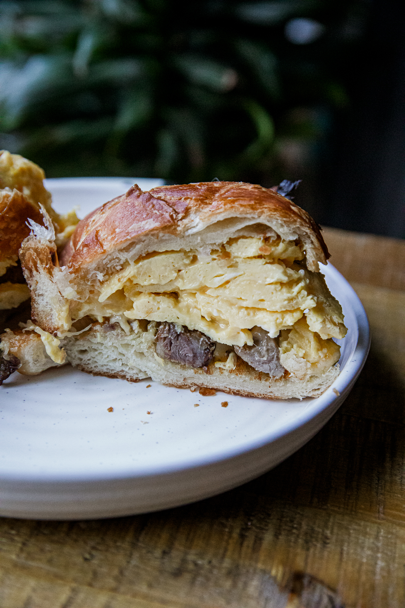 - Assemble – Take your toasted croissants and spread some of the mayo mixture on one side. Top with a pile of the prime rib, and then heap on some of those cheesy scrambled eggs. Top with the other half of the croissant and dig in!