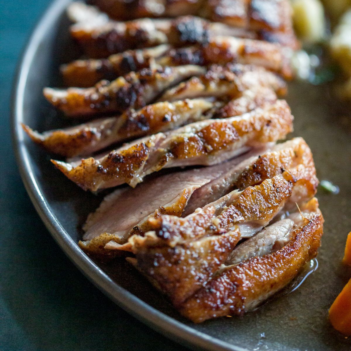 Our Sous Vide Duck Breast is made by vacuum sealing a duck breast, cooking it in the water circulation bath at 120° for 2 hours. Then, the breast gets sauteed skin-side-down to crisp up before being served with mashed potatoes and a rich pan sauce.