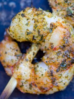 Chimichurri Shrimp Skewers cooked and smoked on a Traeger grill give fresh bold flavors all with the warm smokiness of live-fire cooking.