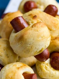 These Pigs in a Blanket are a quick, fun summer lunch idea that kids will love and are a classic finger food for parties! All you need to make this recipe are two simple ingredients and an oven!