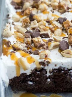 This Snickers Cake is rich, gooey, and loaded with everything you love about the candy bar. We’re talking chocolate cake soaked in caramel and sweetened condensed milk, topped with whipped cream, chopped Snickers bars, roasted peanuts, and more caramel drizzle. It’s easy to make and even easier to eat. No special tools, no complicated steps, …