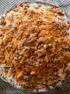 Our Butterfinger Fluff Pie combines the crunchy Butterfinger bits with the creamy texture of a classic fluff pie. This dessert features a homemade graham cracker crust filled with a whipped mixture of cream cheese, vanilla pudding, and marshmallows, topped with more Butterfinger bits. This treat is perfect for an indulgent dessert that’s both easy to …