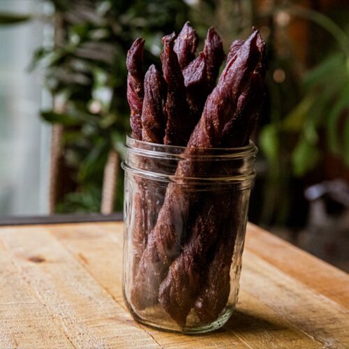 Twist the strips of beef and lay out on a jerky rack. Smoke for 3-4 hours, or until the jerky is as dry as you prefer.